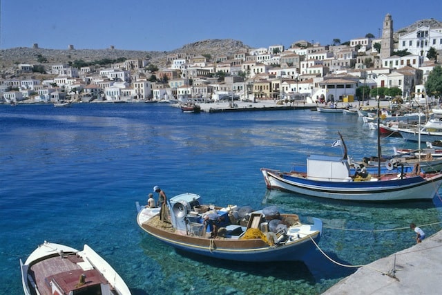 Weniger Trubel, dafür viel Ruhe und Ursprünglichkeit finden Urlauber auf der nur 28 Quadratkilometer großen Insel Chalki. Hier logiert man entweder im einzigen Hotel der Insel oder in Appartements, die teilweise direkten Zugang zum Meer haben. Ungewöhnlich für die Dodekanes ist die Architektur hier. Im Gegensatz zu den üblichen weißen Häusern der griechischen Inselwelt sind viele Häuser auf Chalki in Pastellfarben gestrichen und haben tempelartige Vorderfassaden. Viel Zeit benötigt man nicht, um die Hauptstadt Nimporio mit dem kleinen Hafen zu erkunden. Zu den Sehenswürdigkeiten gehört die Kirche des Stadtpatrons „Heiliger Nikolaus“ mit dem höchsten Glockenturm auf der ganzen Dodekanes und einem hübschen schwarzweißen Kieselmosaik im Kirchhof. Eindrucksvoll der steinerne Uhrturm, der das neoklassizistische Rathaus überragt. Nur ein paar Kilometer westlich liegt die alte Inselhauptstadt mit kleinen Steinhäusern aus antikem Baumaterial. Dort lohnt sich auch der Anstieg auf die von den Johannitern erbaute Burg. Von oben eröffnet sich ein Panoramablick auf die schöne Umgebung und das weite Meer. Wie auf allen ägäischen Inseln sind die Wassersportmöglichkeiten vielfältig. Neben Bademöglichkeiten mit Sonnenliegen am Sandstrand bei Pontamos oder am Kieselstrand Ftenayia gehört Tauchen zu den beliebten Freizeitaktivitäten. Während man die Fischer am Abend im Hafen dabei beobachtet, wie sie die fangfrischen Tintenfische auf dem Fels weich schlagen, lässt man sich Selbigen in einer der gemütlichen Tavernen vom Grill servieren und genießt den Sonnenuntergang.
