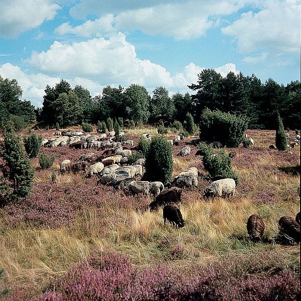 Wer Glück hat, trifft in der Lüneburger Heide auch Heidschnuckenherden.