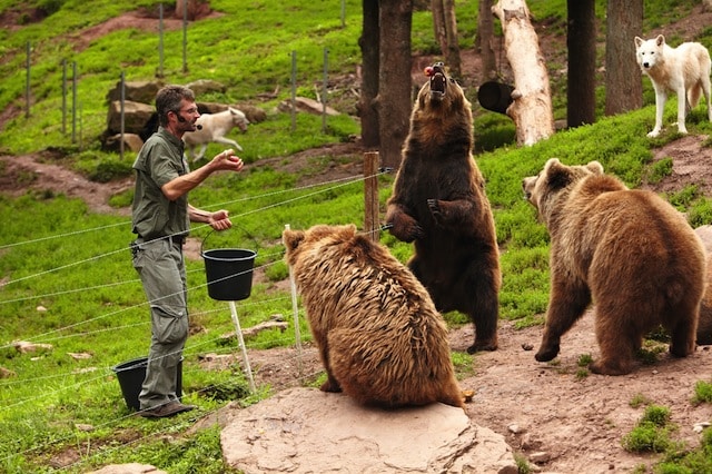 Spannung ist geboten bei den täglich – außer freitags – stattfindenden Zusatzprogrammen, die im Eintrittspreis bereits enthalten sind. Um 11.30 und 15.30 Uhr findet die Flugvorführung auf der Falknertribüne statt. Adler, Geier und Milan gleiten majestätisch über die Köpfe der Zuschauer hinweg, während man vom Falkner allerhand Wissenswertes über die Verhaltensweise der Greifvögel erfährt. Um 14.30 Uhr können die Besucher den Wildhüter bei seiner Fütterungsrunde begleiten. Kaum taucht er am Gehege von Bär, Luchs, Wolf & Co. auf, kommen die Beutegreifer angerannt, um sich die größten Beutestücke zu sichern.