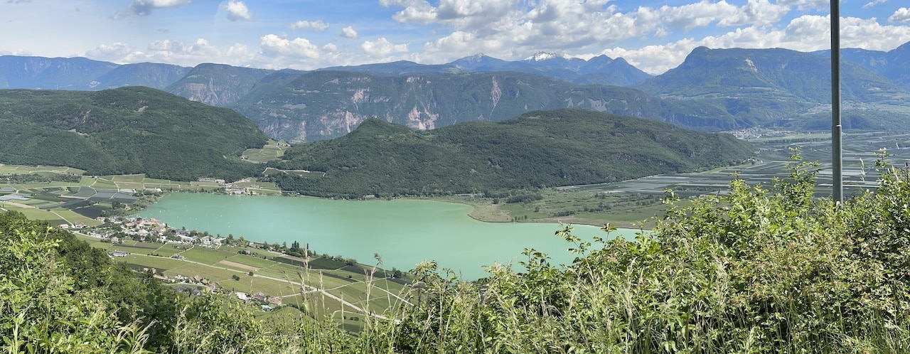 Wer es lieber gemütlich mag ohne große Anstrengungen ist mit einer Wanderung um den Kalterer See gut bedient. Der gut ausgeschilderte Seerundweg ist ca. 7 km lang und wirklich leicht ohne Ansteigungen zu gehen. Rechts und Links des Weges befinden sich Obstwiesen und Weingärten. Ein großer Teil des Seerundweges führt durch ein Biotop durch eine idyllische Schilf- und Sumpflandschaft. Eine Mischung aus Asphalt, Schotter- und Forstwegen macht den Weg auch für Radfahrer interessant. Eine gemütliche Einkehrmöglichkeit besteht beispielsweise im Gasthof Klughammer, in den Seewiesn, im Lido oder in einem der zahlreichen Gastronomen rund um den See. Mit Pausen vergehen schon ein paar Stunden. Leider ist der Zugang zum See nur sehr schwer. Also läuft man nicht indirekt am Ufer des Sees entlang. Wenn Sie im See baden möchten, müssten Sie entweder Gast auf dem Campingplatz St. Josef am See oder im Gretl am See sein. Wir hatten einen privaten Seezugang über unser Appartement. Und einen öffentlichen Badezugang zum See gibt es auch beim See-und Strandbad Klughammer. Für Gäste des Residence Haus Kalterer See ist das Baden kostenlos. Das Freibad Lido am See öffnet allerdings erst Mitte Mai, sodass es noch geschlossen war, als wir dort waren. Der Kalterer See ist also nicht vergleichbar mit einem Baggersee, Natur- oder Talsperrensee wie wir ihn zum Beispiel aus Deutschland kennen und man freien Zugang zum See hat. Trotzdem ist der Weg durchaus lohnenswert. Das sollte einem vorher klar sein, bevor man einen Badeausflug plant und hinterher enttäuscht wird.